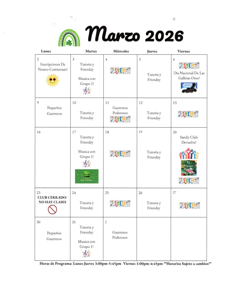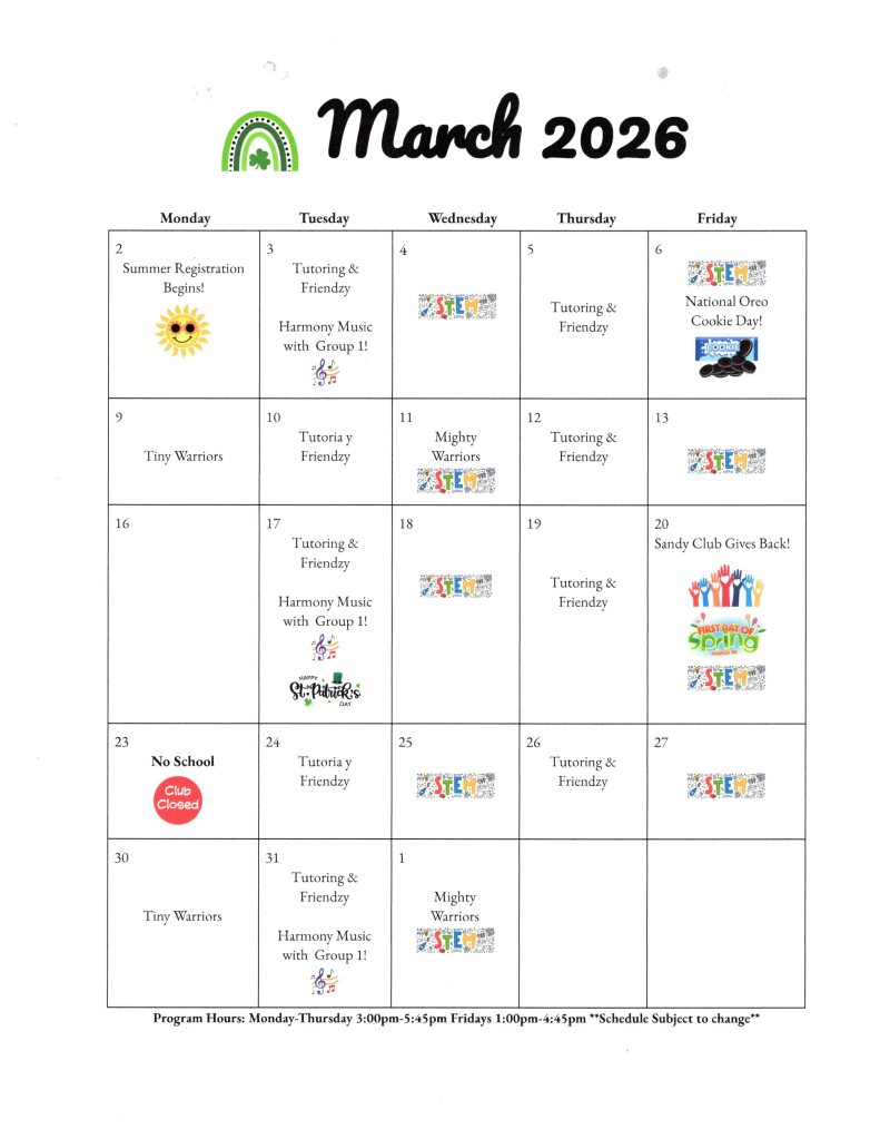 Calendars are updated each month with activities for the children and important information regarding the club schedule. Paper copies of the monthly calendars are available at the front desk.