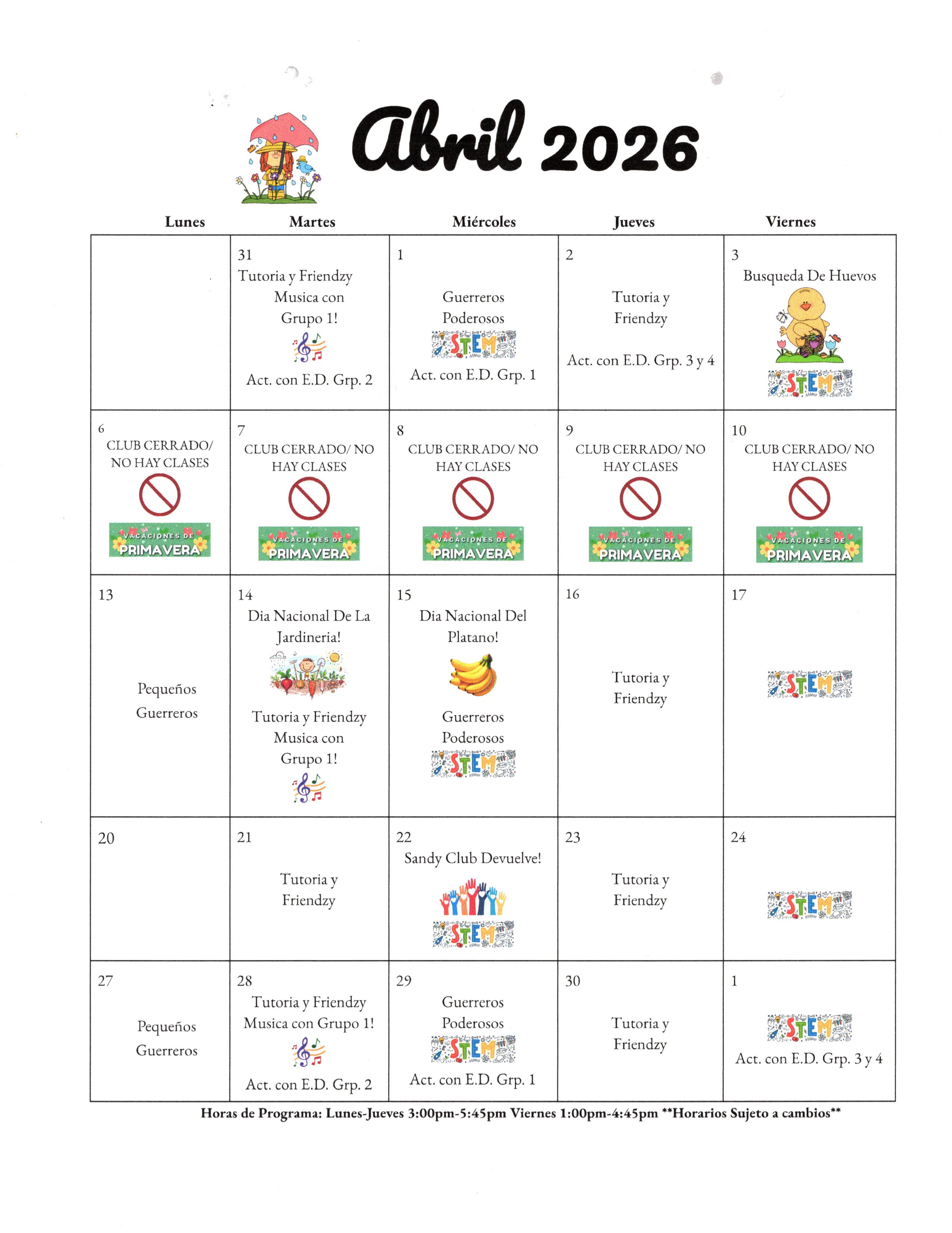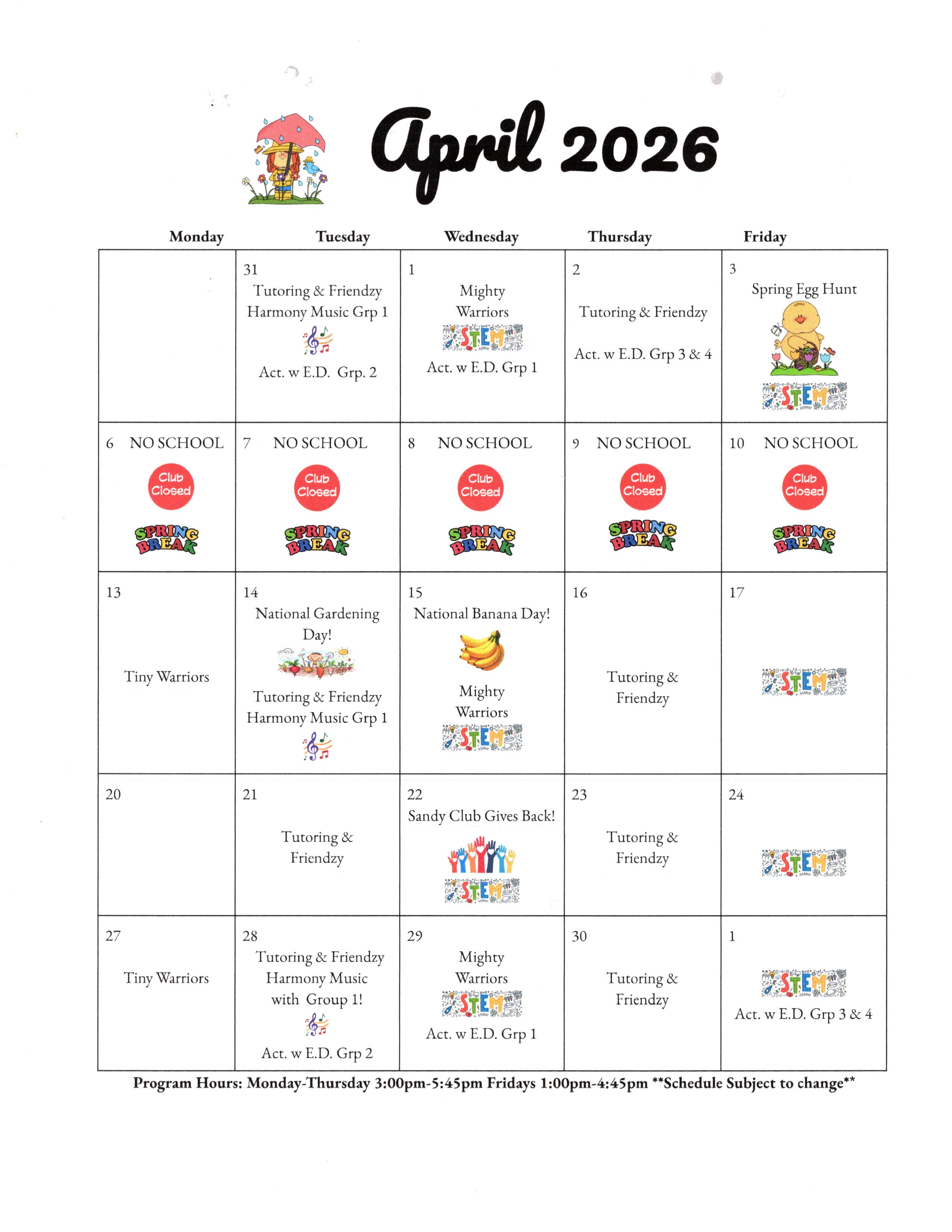 Calendars are updated each month with activities for the children and important information regarding the club schedule. Paper copies of the monthly calendars are available at the front desk.